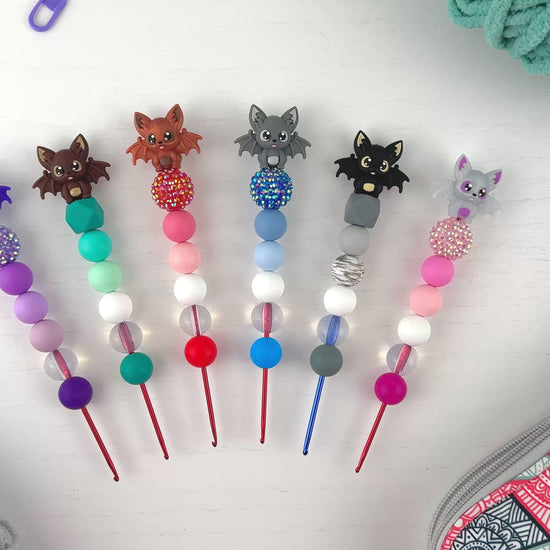 Custom Crochet Hook | Silicone Beaded Handle with Kawaii Bat Charm Topper