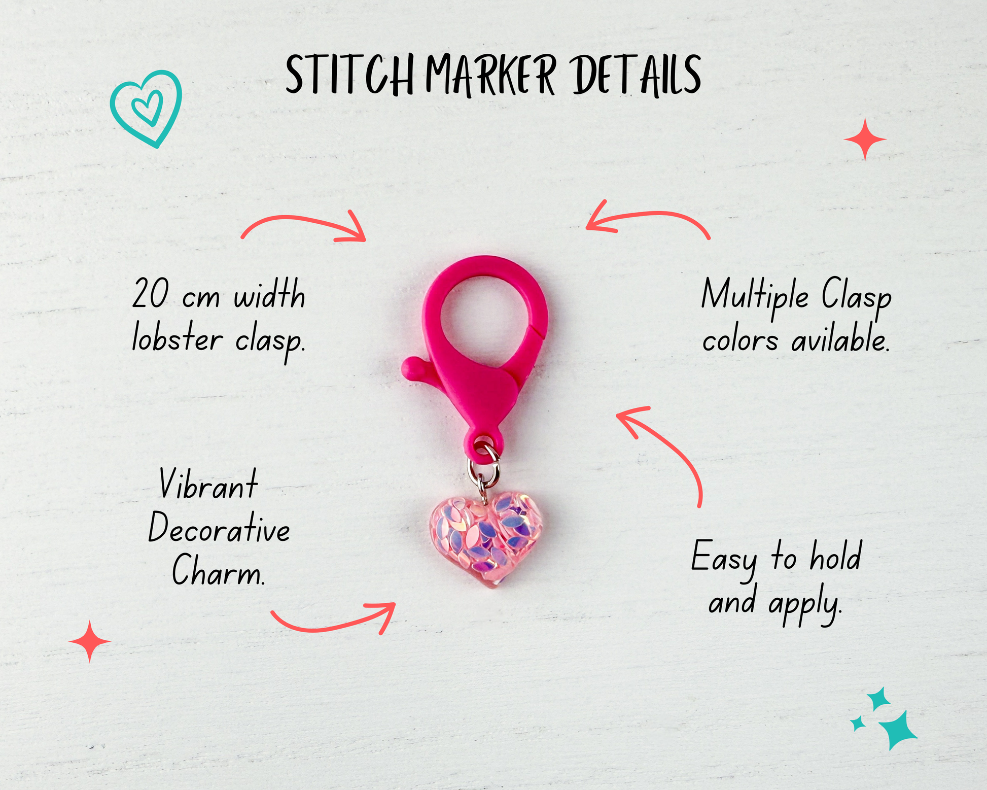 🩵 Add a pop of color and charm to your crochet or knitting projects with this set of adorable stitch markers! Each marker features a unique colorful and glittery heart charms attached to a sturdy plastic lobster clasp, making it easy to attach and remove as you work. Perfect for keeping track of stitches, rows, or patterns, these stitch markers are both practical and stylish—a great addition to any crafter’s toolkit or a thoughtful gift for a crochet or knitting enthusiast!