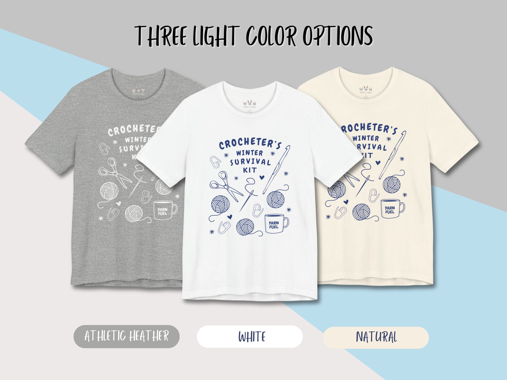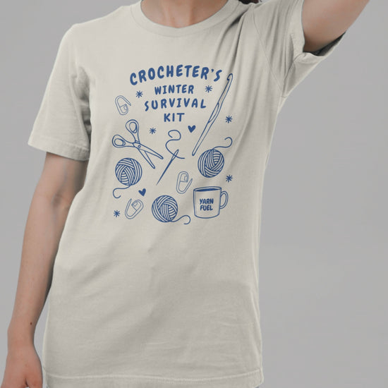 Stay cozy and crafty all winter long with this fun tee designed just for crocheters! Featuring the playful quote âCrocheterâs Winter Survival Kitâ and adorable hand-drawn style illustrations of every makerâs essentialsâcrochet hook, scissors, stitch markers, needles, yarn, and of course a coffee mug labeled âYarn Fuel.â